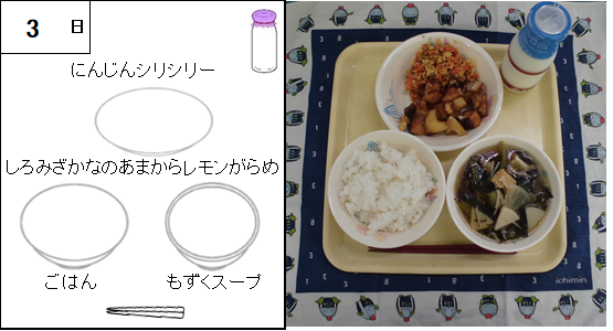 主食の白身魚 は、シイラを使っています。沖縄では、シイラを「フーヌイユ」「富 の魚 」と呼 び、幸運の魚といわれています。10 月から12 月に旬を迎 える旬の魚です。「にんじんシリシリー」は、にんじんを千切りにし、卵といためる沖縄の郷土料理です。スープには、もずくが入 っています。もずくの最大の産地は沖縄県 で、今日のスープのもずくも沖縄県産です。沖縄の食材や料理を楽しんで食べましょう。