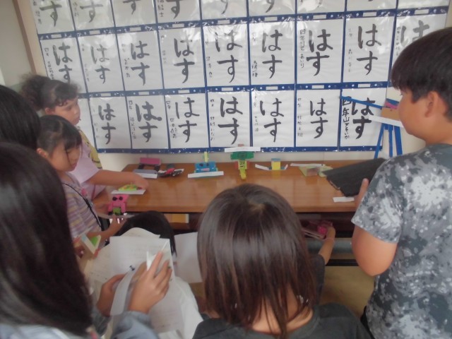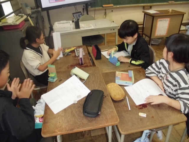図工の学習で、お互いの制作物を鑑賞し合い意見を交流しました。