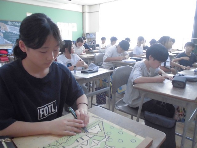 図画工作の時間では、現在取り組んでいる作品の「彫りの作業」に集中して取り組みました。彫刻刀の扱いに気をつけながら、自分のイメージを形にするために、真剣なまなざしで細かい作業を進めていました。完成が楽しみな作品ばかりです。