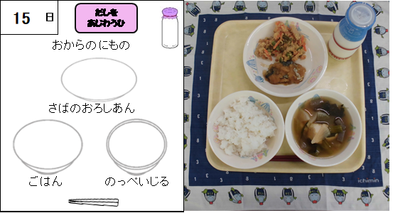 今日はだしを味わう日です。今日のだしは、かつお節とこんぶの合わせだしです。かつお節とこんぶの合わせだしは、まず、こんぶのだしをとることから始まります。こんぶは水にひたし、戻ったら鍋に火をつけます。こんぶはぐつぐつと沸騰させてしまうと、えぐみやぬめりが出てしまうので、沸騰する前に取り出します。そして、そこにかつお節を入れだしをとります。うまみの強い二つの食材を組み合わせることで、深い味わいのだしになります。よく味わって食べましょう。