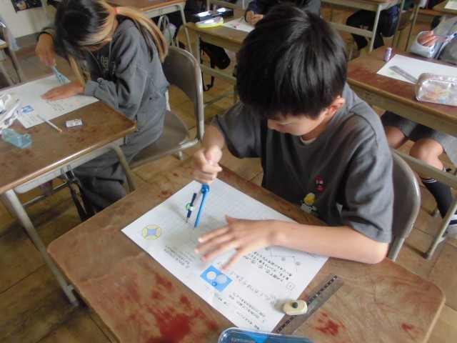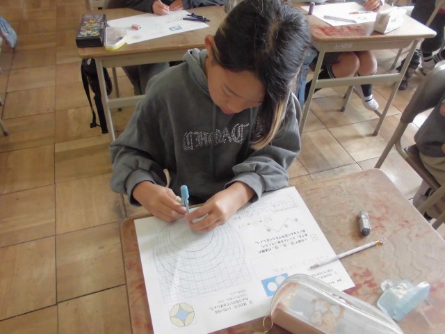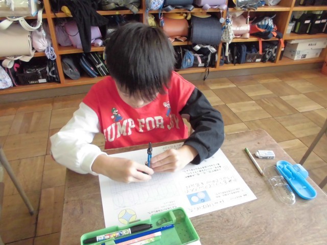 コンパスの学習。いよいよまとめになりました。複雑な図も、きれいにかけるようになってきましたね。