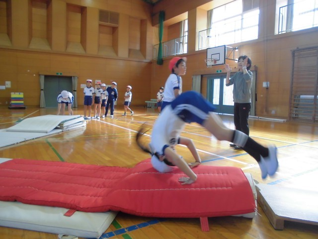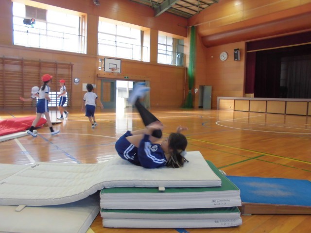 台上前転の練習が始まりました。「跳び箱の上で前転をします!」みんなの驚いた顔。今日は、マットを重ねたり、丸めたりして前転の練習をしました。
