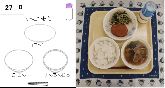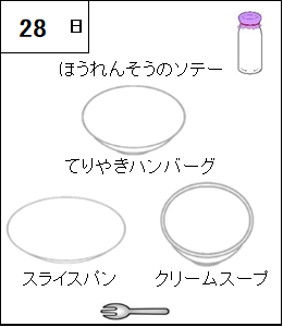 今日の鉄骨和えには、ほうれんそうが入っています。ほうれんそうに含まれる緑色の色素は熱に弱いため、ゆでたり、いためたりすると、暗い緑色になります。鮮やかな緑色にするためには、ゆで時間を短くしたり、ゆであがりに水でひやしたりするとよいです。給食でも、あえ物を作る時には、ゆであがりに水でひやしたり、汁物に入れるときは一番最後に加え、加熱しすぎないようにするなどの工夫をしています。