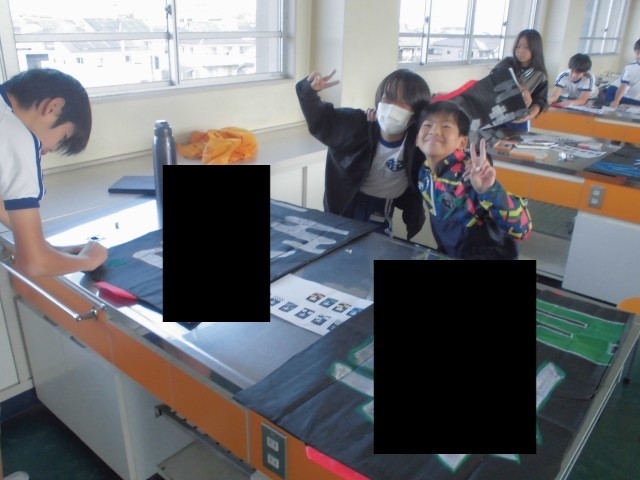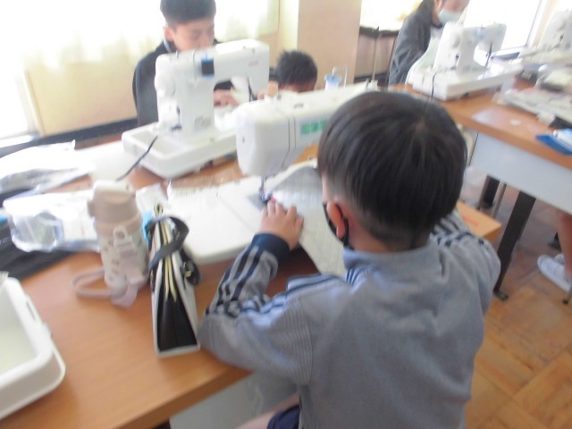 国語の授業では、新出漢字の読み書きに取り組み、語彙力の定着を図っています。書き順やとめ、はねにも注意を払い、丁寧な文字を書く練習をしました。家庭科:ナップザックづくり