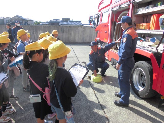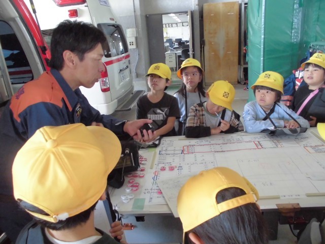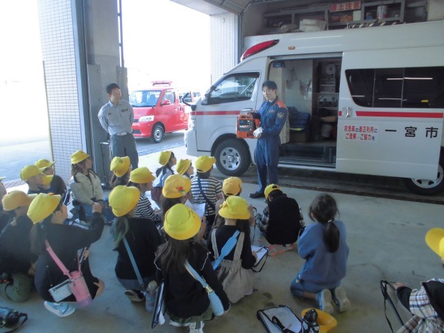 消防署見学に行きました。救急車の中を見学したり、指揮車の役割の説明を聞いたりするなど、普段の生活の中では学べない消防士の仕事を学ぶことができました。