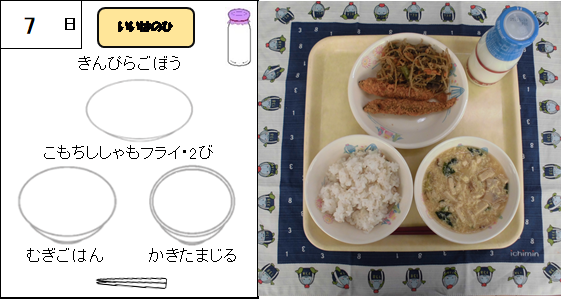 明日、11月8日は「いい歯の日」です。そこで、今日はいい歯の日にちなんでよくかむことを意識し、いい歯を保つための献立です。特徴は2つあります。1つ目は、噛み応えのある料理であることです。よくかむことでだ液が出てくるので、歯が汚れるのを防いでくれます。2つ目は、歯の組織であるカルシウムを多く含んでいます。今日のししゃものような骨ごと食べる魚などには、カルシウムがたっぷりです。健康な歯で食事を楽しむためにも、よくかんで食べることを意識しましょう。