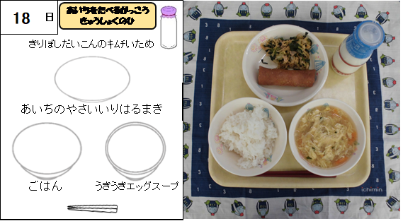 今日は「愛知を食べる学校給食の日」です。愛知県は、自動車産業などの工業も盛んですが、豊かな水源や平野を生かした農業や畜産業も盛んです。毎日登場する牛乳は愛知県産です。また、米も愛知県産です。春巻きやキムチいためには、愛知県で収穫されたキャベツ、れんこん、切干しだいこんが入っています。そして、一宮市の浮野地区で生産された卵が、うきうきエッグスープに入っています。愛知県や一宮市の食べ物の恵みに感謝して食べましょう。