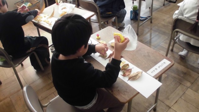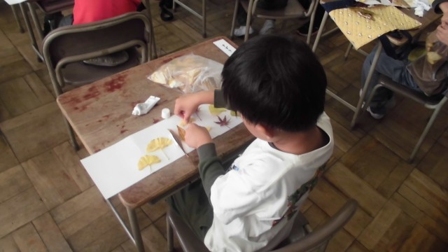 本日の5時間目、生活の時間に冠を作りました。児童たちは自分たちで拾った葉っぱを使って、自分たち好みの作品を作っていました。