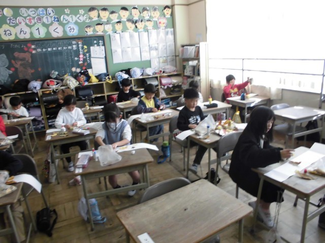 前日に拾った落ち葉でを使って、画用紙に並べて貼りました。きれいな落ち葉をどのように並べるとよいのか考えながら、丁寧に飾りを作りました。