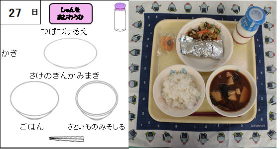 秋が旬の食べ物といえば、何を思い浮かべますか? 今日の給食は、鮭、かきなど旬の食材を多く使った「旬を味わう日」の献立です。春、夏、秋、冬それぞれの季節感を表し、味だけでなく目で楽しみ味わえるのも和食の特徴のひとつです。また和食には、「自然を大切にする」という考え方があります。自然の恵みを大切に受け取る気持ちで食べたいですね。