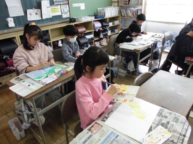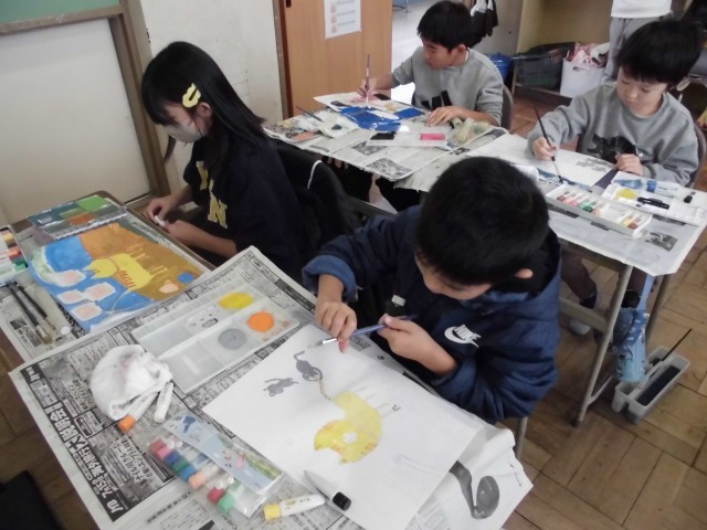 図工の授業の様子です。今日で読書感想画が完成しました。本を読んで自分が心に残ったところを絵にすることができました。