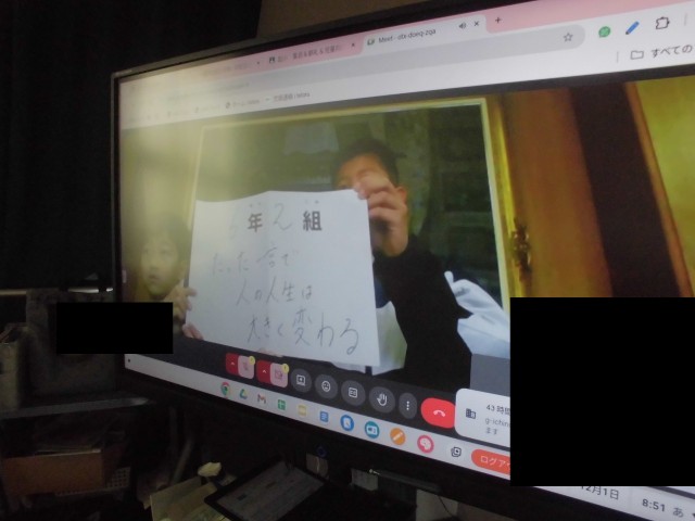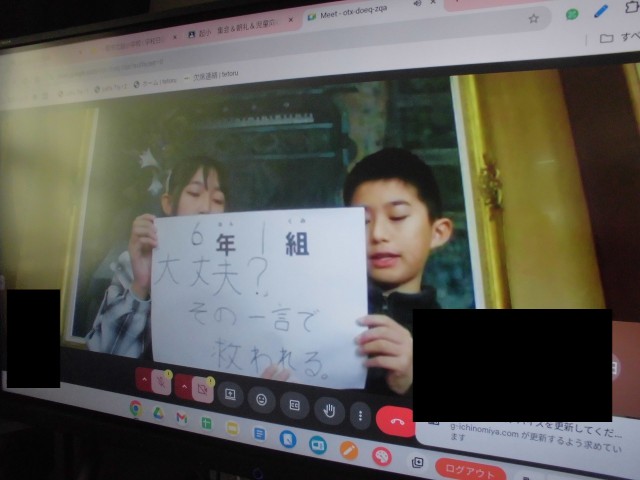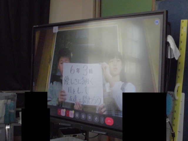 各教室の大型モニターに映像を配信し、全児童が静かに参加しました。
