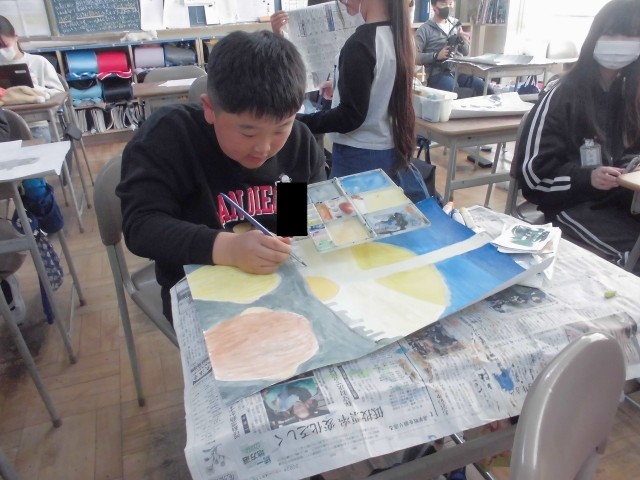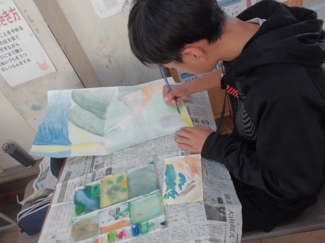 児童たちは、読書で感じた感動や心に残った場面を、色や形で豊かに表現しました。真剣な表情で筆を動かし、それぞれの心象風景をキャンバスに描き出しました。