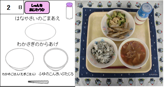 今日は、「旬を味わう日」の献立です。「旬」とは食べ物がおいしくたくさん収穫できる時期のことです。今日の旬の食材は、「わかさぎ、だいこん、かぶ、ブロッコリー」です。このうち「だいこん」は、冬に大活躍する野菜です。生でも煮てもおいしく食べられ、消化を助ける働きがあります。今日は、豚汁の中に入っています。また、 わかさぎは、骨ごと食べることができるので、成長に必要なカルシウムをとることができます。