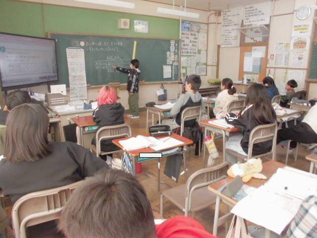 今日の算数の時間は、「比例と反比例」の学習で、表から読み取った情報を発表する活動を行いました。