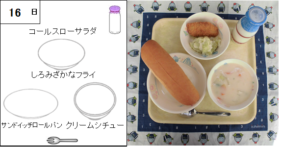 今日 は、サンドイッチロールパンに、白身魚 フライとコールスローサラダをはさんで食 べるメニューでした。