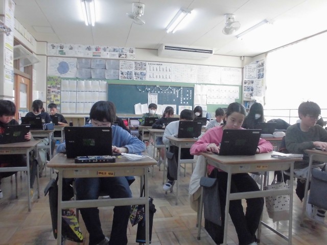 社会科の時間には、来月のテストを見据えて、タブレットを使った復習問題に取り組みました。