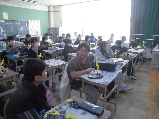 図工の「未来の私」では、いよいよ針金の骨組みに粘土をつけ、「肉付け」の作業に入りました。