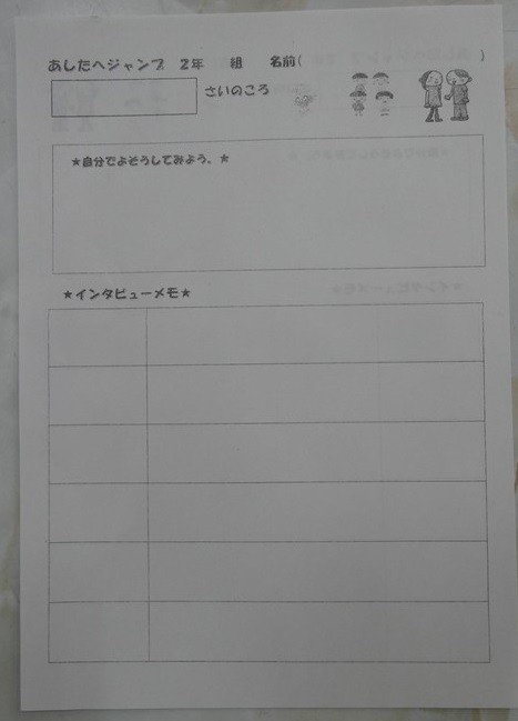 また、本日子どもたちに次の単元で使うプリントを配付しました。次の生活科では、小学校入学前までの自分について聞いたことをまとめる学習を行います。保護者の皆様には、学年だより1月号に掲載した写真の準備をお願いします。また各クラスでまとめる上で、家の人にインタビューをする内容を考えました。この連休中に子どもたちが質問をしますので、ぜひお答えください。宜しくお願いいたします。