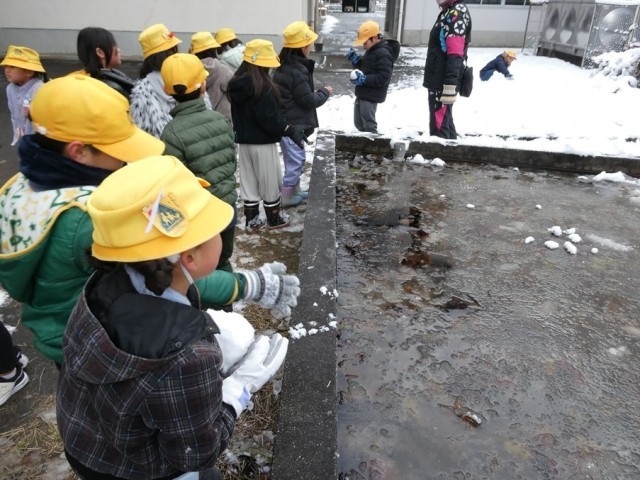1時間目に生活科の内容として、冬の生き物の観察を行いました。今までの季節との違いや雪が降ったときにしか見ることができないものなどを見つけることができました。池が凍っている様子を驚いている姿も見られました。
