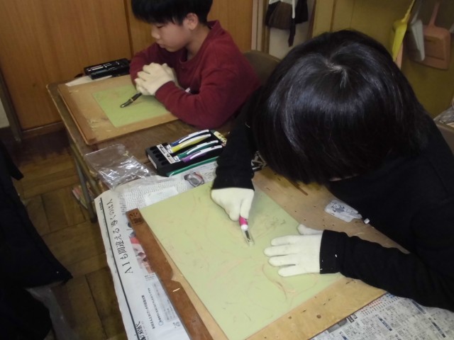 いよいよ彫り始めました。初めての感触を楽しみながら丁寧に線を表しています。