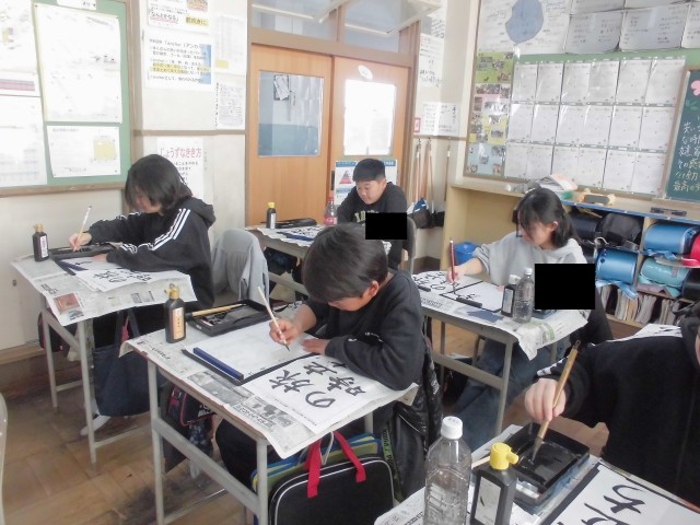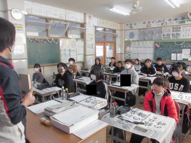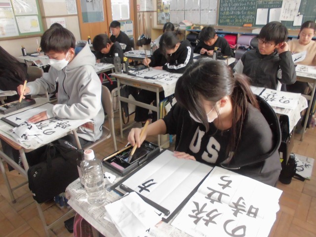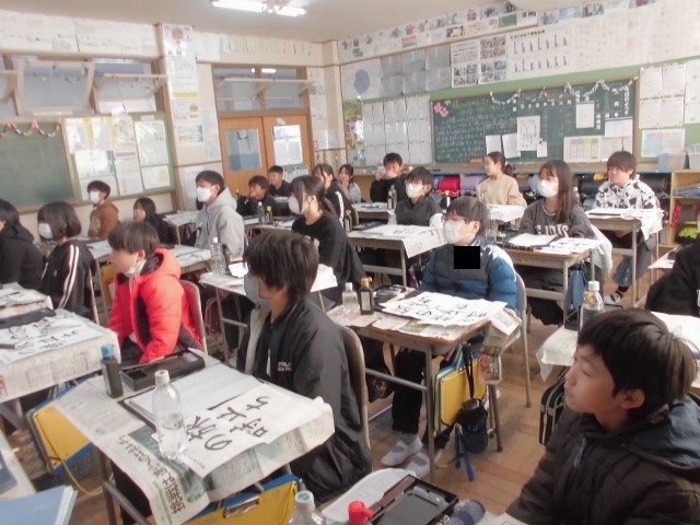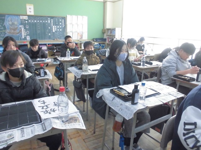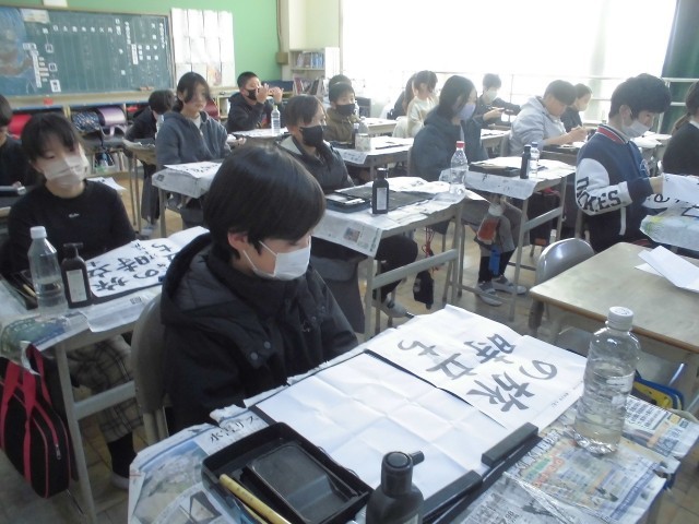 その後、書初めの清書として「旅立ちの日に」という文字を書きました。先ほどの話を受けて、自分の未来や仲間への思いを筆先に込め、一画一画を噛みしめるように書き上げる姿が非常に印象的でした。