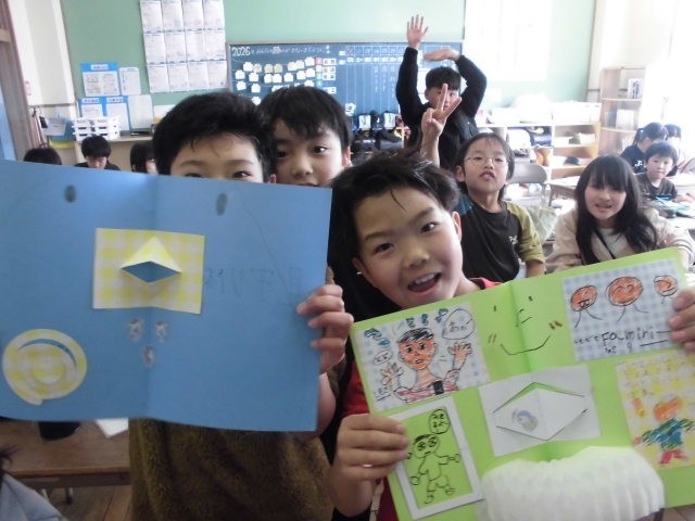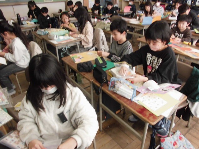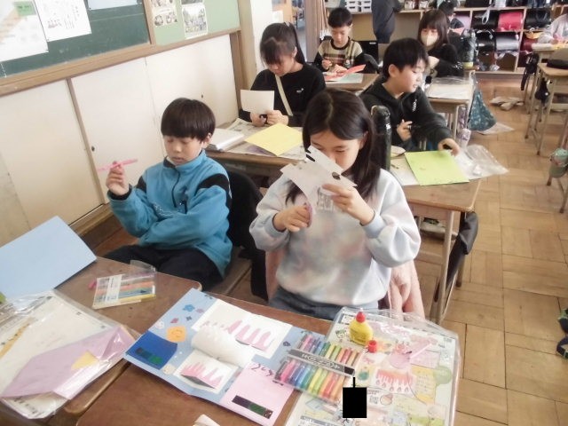 図工の授業の様子です。4年生最後の作品を制作しています。お世話になっている人へメッセージカードを作りました。完成が楽しみですね。