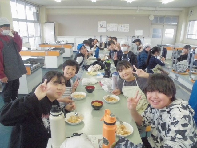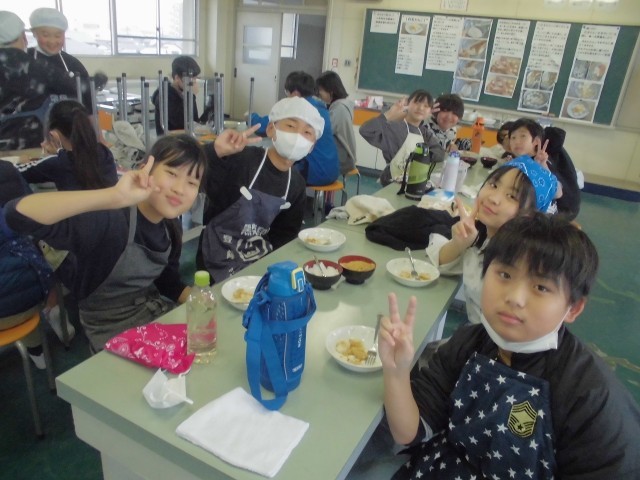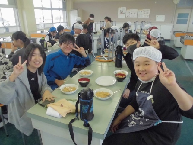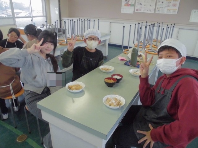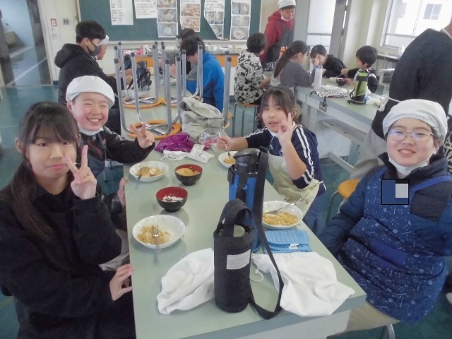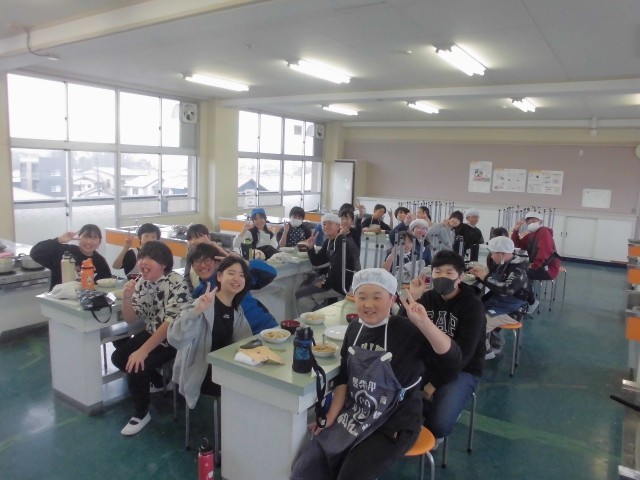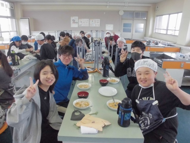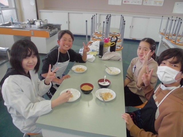 卒業前の思い出作りとして調理実習を行いました。班の仲間と声を掛け合い、協力して作った「白玉団子」の味は格別だったようで、教室にはたくさんの笑顔が溢れていました。