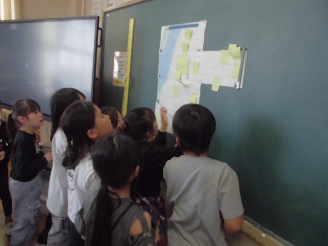 本日の社会科の学習では、起の町のお気に入り場所についてグループで出し合い、付箋に書いて貼る活動をしました。
