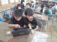 図工で一版多色版画を制作しています。彫刻刀で彫ったあと、絵具を使って多色刷りをしています。完成作品が楽しみです。