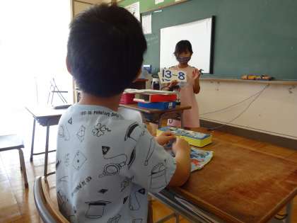 5時間目の初めに、頭の体操として、フラッシュカードを使って簡単な計算に取り組みました。子ども達は元気よく、楽しそうに練習に取り組みました。慣れてくると、すぐに答えられるようになりました。今後も定期的にウォーミングアップとして取り入れていこうと思います。