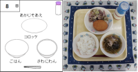 今日の献立は「ごはん、牛乳、ヘルシーマーボードウフ、バンサンスー」です。