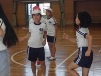 体育館では仲間と声をかけあってバレーボールのパスををつなぐ練習をしています。