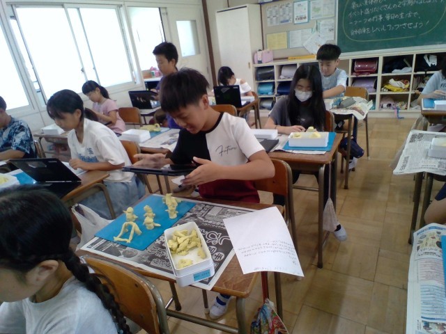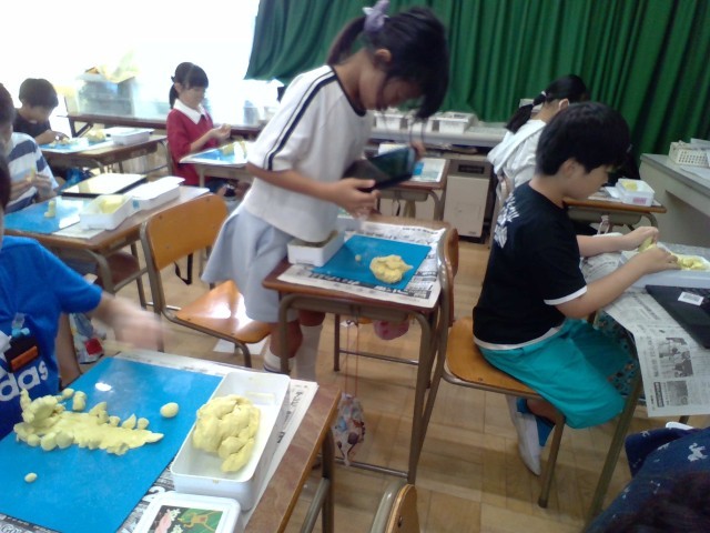 図工では粘土とパソコンを使った学習をしています。粘土を少しずつ動かしたり、変形させたりしながら写真をとり、それをつなげてアニメーション化しました。だんだん動物が出来上がるものや、スポーツの得点シーンなどたくさんの作品ができました。