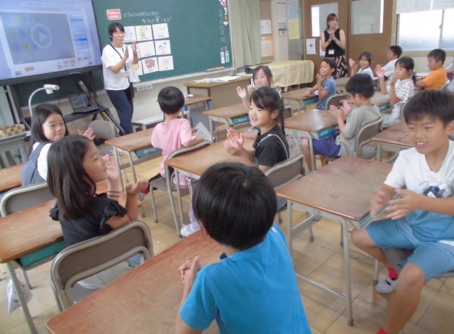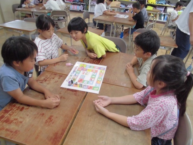 子どもたちが楽しみにしている英語の授業がありました。英語の歌に合わせて体を動かしたり、動物の種類を英語で言ったりしました。友達とすごろくをしながら、英語で動物の名前を繰り返し言うことで、楽しく覚えることができました。