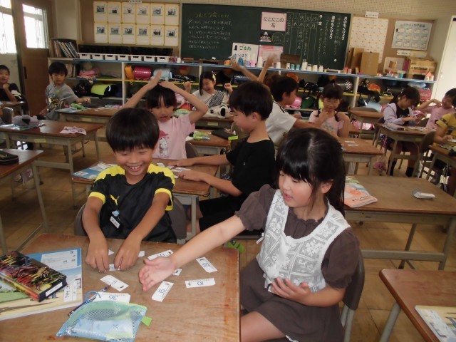 2年生の算数の授業では、いよいよかけ算の勉強が始まりました。最初の九九は5のだんを覚えました。九九カードを使って、楽しみながらみんなで繰り返し学習しました。