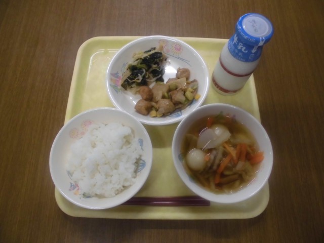 今日の献立は、「ごはん、牛乳、鶏団子と里芋の揚げ煮、わかめの酢の物、もち入りすまし汁」でした。