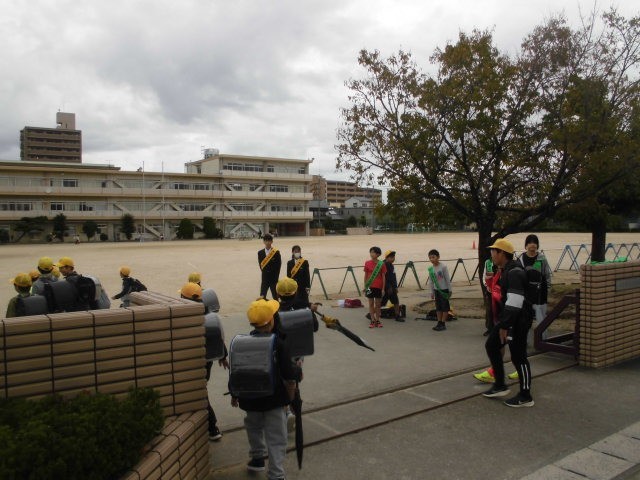 中学校の代表生徒4人が来校し、登校する児童に向けてあいさつの呼びかけを行ってくれました。
