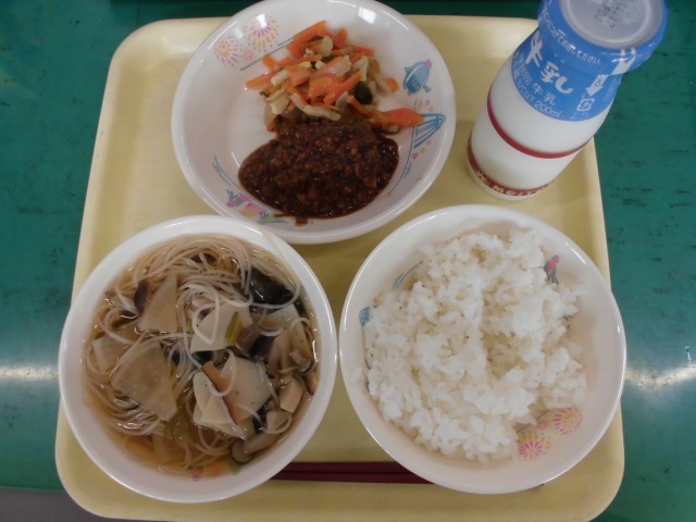 今日の献立は「ごはん・牛乳・とうふの肉みそかけ・いろどりいため・きのこのすまし汁」でした。