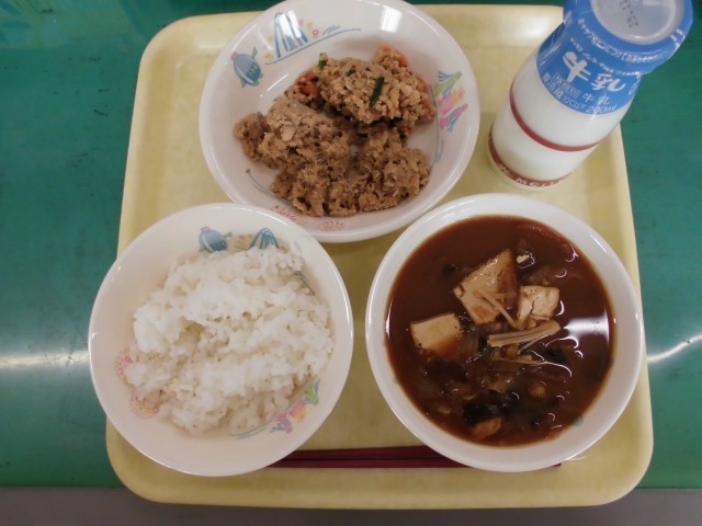今日の献立は「ごはん・牛乳・3種のおさかなそぼろ丼(具)・彩り納豆・白菜のみそ汁」でした。