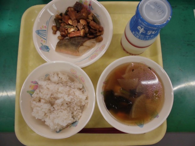 今日の献立は「麦ごはん・牛乳・ほっけの塩焼き・鉄火みそ・けんちん汁」でした。