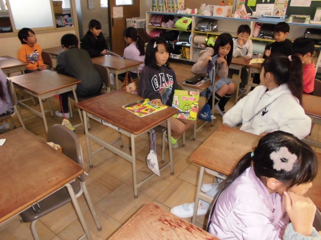 今日は4年生とのペア読書で、読み聞かせをしてもらいました。2年生のペアの子のために、それぞれが選んでくれた本です。2年生は4年生が読んでくれるお話を、熱心に聞いていました。読んでもらった後に「おもしろかった。」とか「楽しいお話だった。」などと感想を伝えていました。