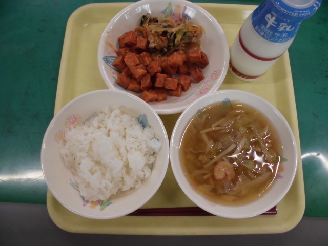 今日の献立は「ごはん・牛乳・生揚げのヤンニョム・チャプチェ・えび入りトックスープ」でした。