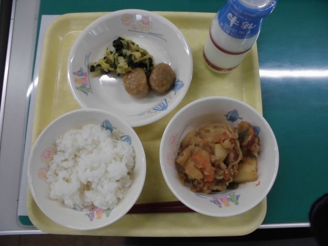 今日の献立は「ごはん・牛乳・つくね・おひたし・肉じゃが」でした。