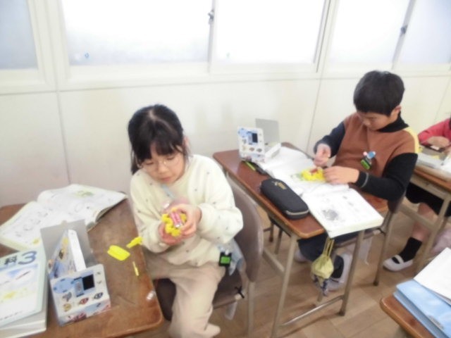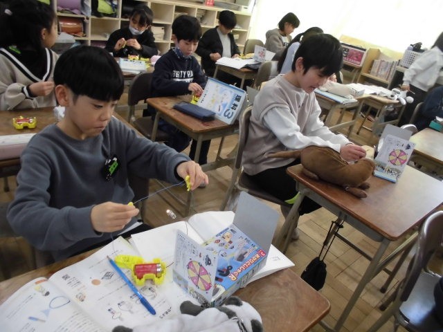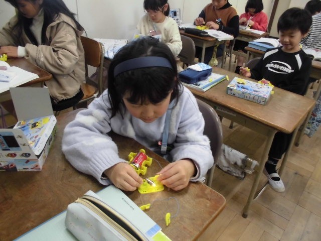 今週の理科では学習したことをもとに、自分なりに導線をつなぎ、豆電球が光る回路をつくりました。