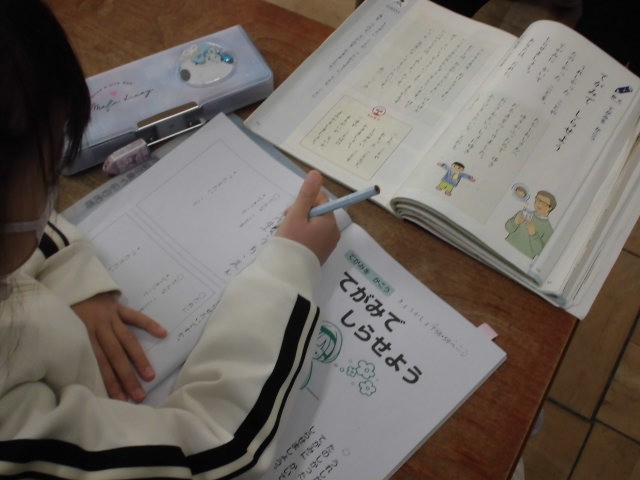 1年生は、国語の時間に、うれしかったことや、楽しかったことを手紙に書いて知らせる学習をしています。うれしかったことや楽しかったことを思いだし、だれに手紙を書こうか考えています。
