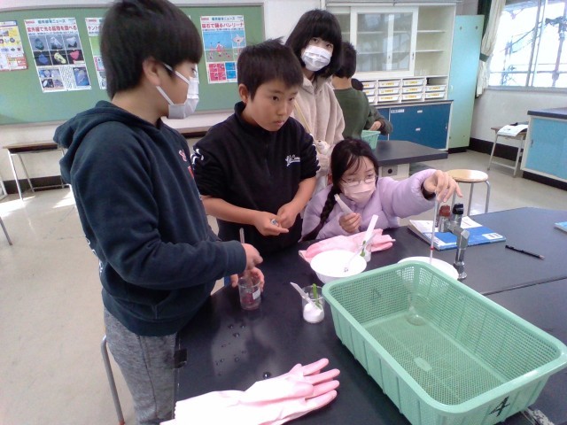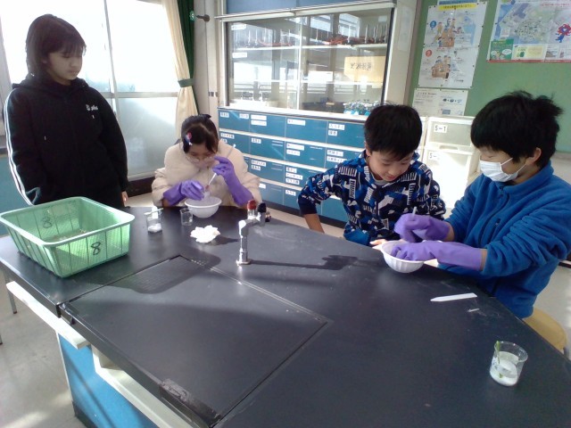 水の温度を変えると溶けるものの量が変わるのか、実験をしました。正確な結果が出るよう、水の量を1mLまで量ったり、溶かす食塩を1gの間違いもなく入れたりしました。役割分担をしながら、班で協力して取り組むことができました。