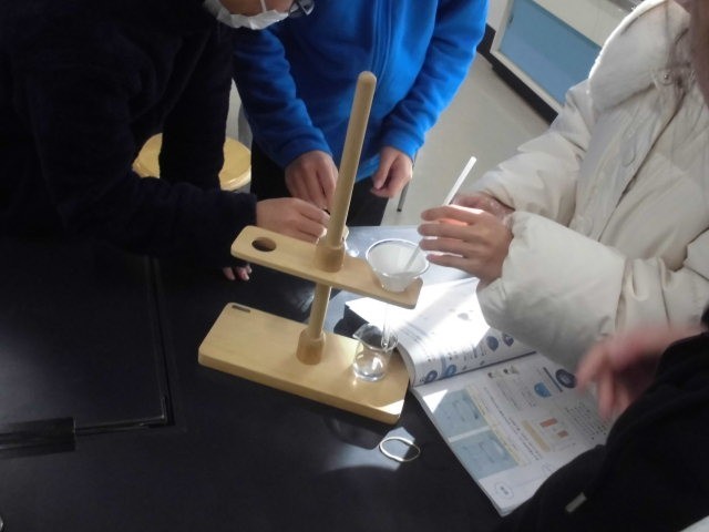 1月13日 5年理科「ものの とけ方」 公開日 2026/01/13 更新日 2026/01/13 5年生 5年生は、理科の時間に「ものの とけ方」の単元の学習をしています。 授業では、ろ紙を使って固体と液体を分ける「ろ過」を実験しました。