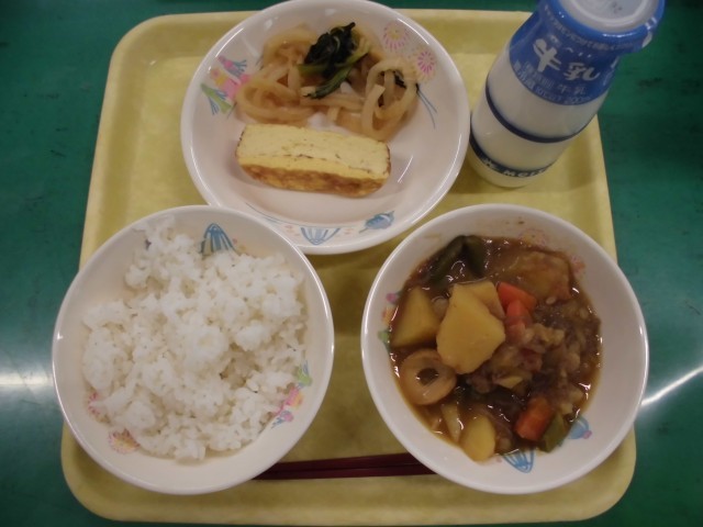 今日の献立は「ごはん・牛乳・厚焼き卵・切干し大根の甘酢和え・肉じゃが」でした。