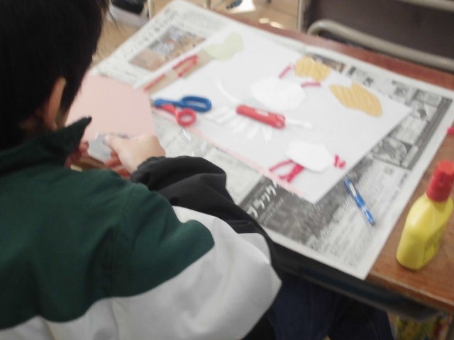2年生は、図工の時間に、紙で作った形を写して、作品作りをしています。どんな形でどんなことを表せるか、工夫して仕上げていきます。